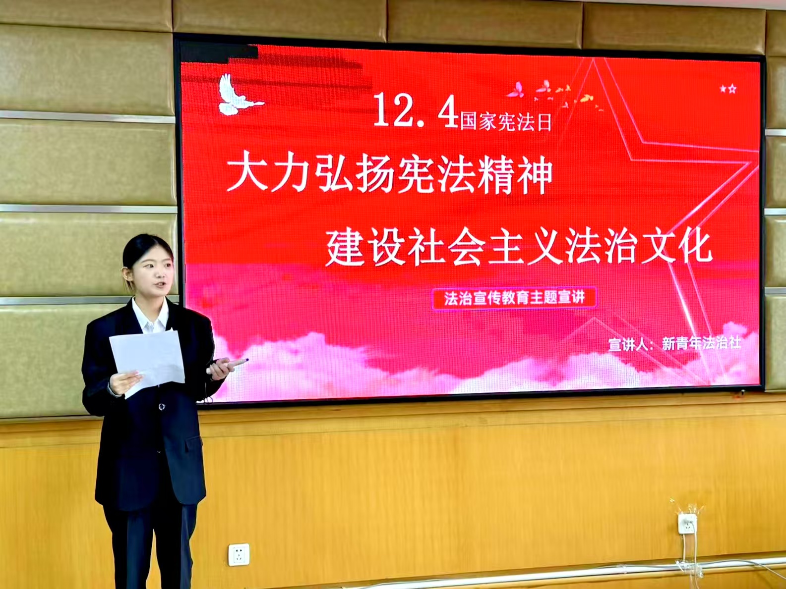 首先,宣讲人以“大力弘扬宪法精神,建设社会主义法治文化”为主题,围绕熟识宪法知识、宪法伴我成长、坚定宪法自信和树立法治信仰四个方面对《宪法》进行了深入且全面的解读,使同学们清楚认识到了宪法作为国家根本大法所发挥的重要作用。随后,宣讲人以一段记录宪法与公民成长的短视频,展现了宪法在公民从出生到成长各个阶段所起到的保障作用,让现场学生直观感受到宪法与个人的紧密联系,更加深刻地感悟到宪法的重要性。最后,主讲人带领学生回顾了历年宪法宣传主题,从“弘扬宪法精神,建设法治中国”到“学习贯彻党的二十大精神,推动全面贯彻实施宪法”,展现了我国法治建设的阶段性目标与新时代青年的历史坐标,并呼吁全体学生增强法治意识,弘扬宪法精神。